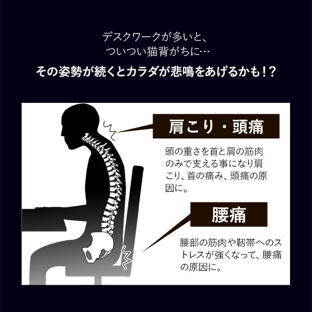 「正しく座る」を3Dサポート The 背クッション/The 座クッション2点セット デスクワークが多いと、ついつい猫背がちに… その姿勢が続くと身体が悲鳴をあげるかも!? ・肩こり/頭痛 頭の重さを首と肩の筋肉のみで支えることになり 肩こり、首の痛み、頭痛の原因に。