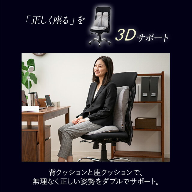 「正しく座る」を3Dサポート 背クッションと座クッションで、 無理なく正しい姿勢をダブルでサポート。